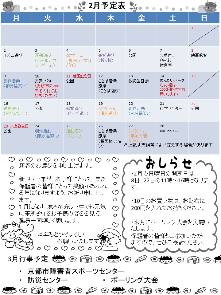 2月の予定表です。様々なイベントを予定しています。